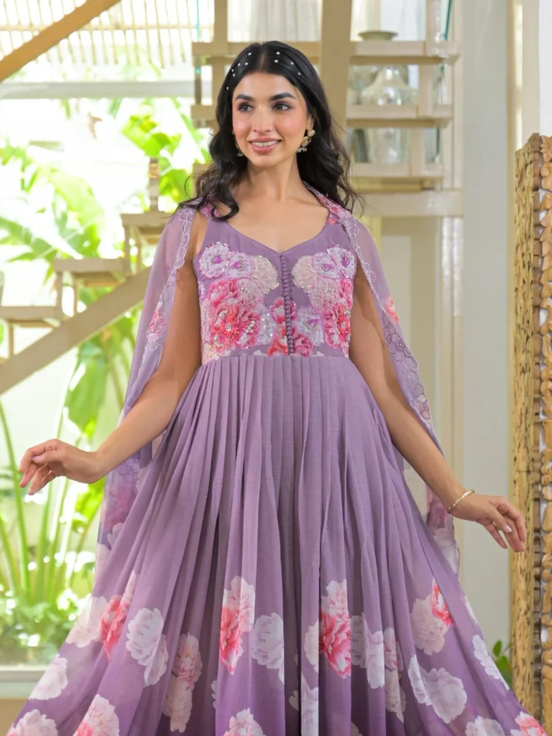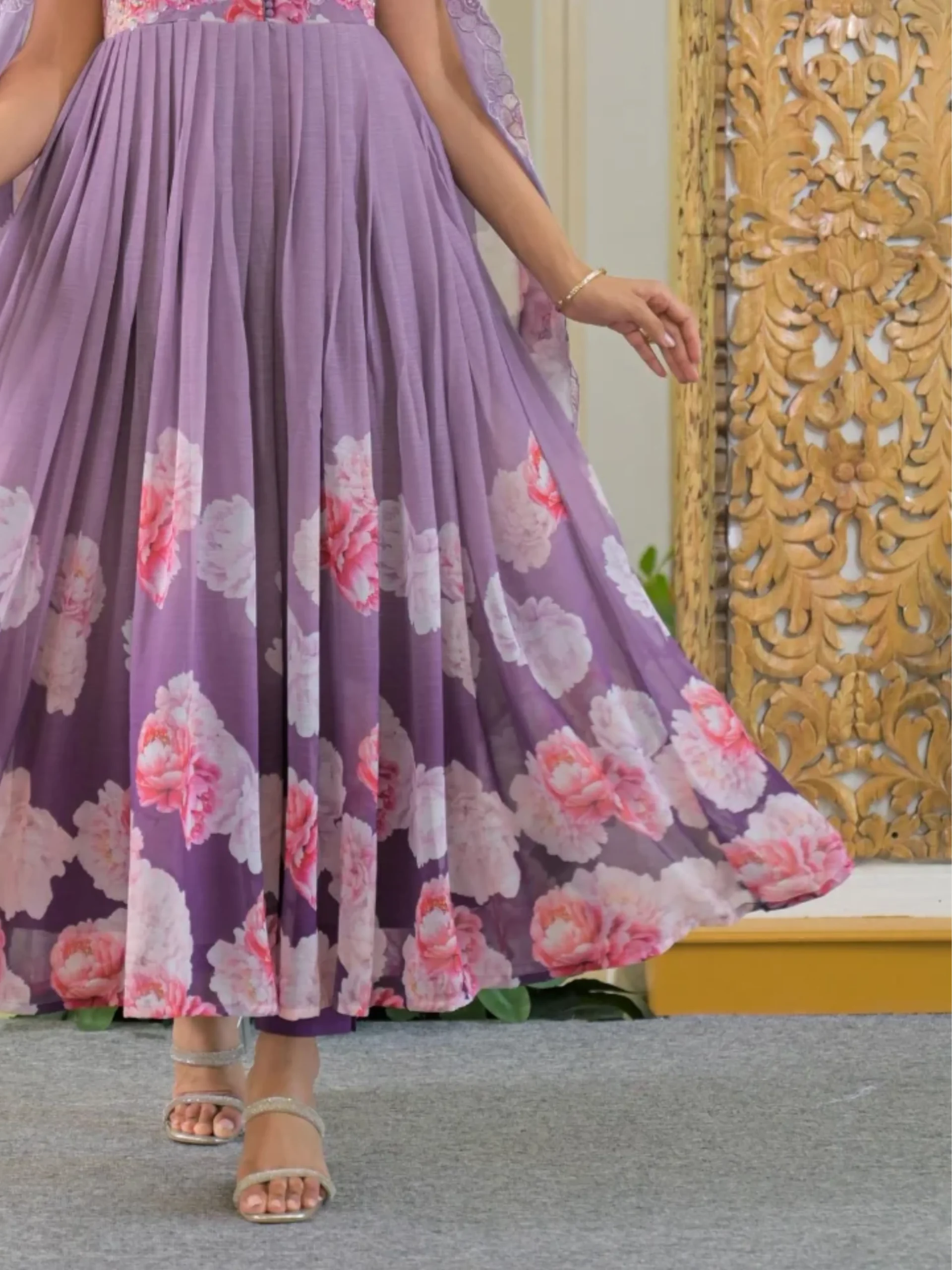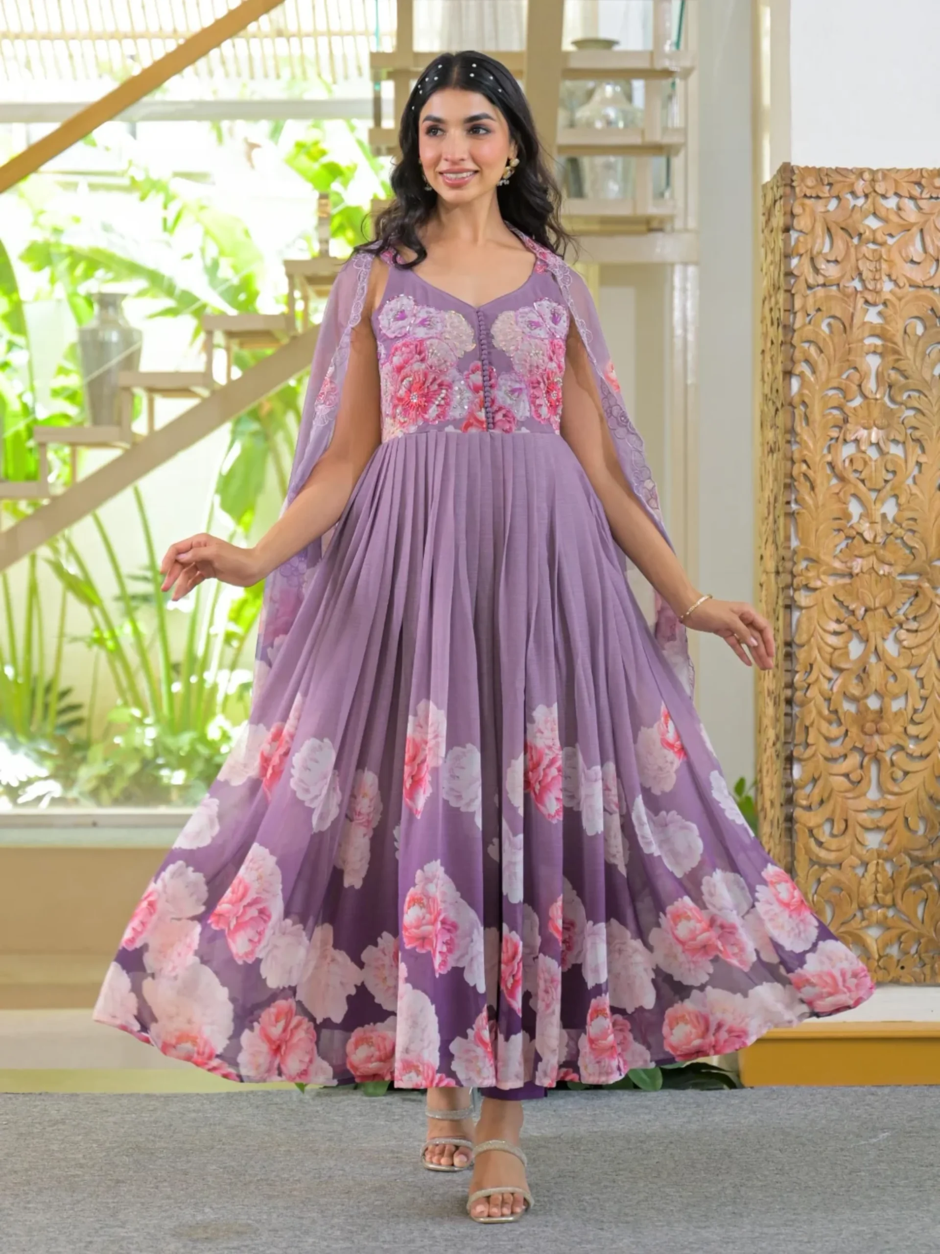 Stylish lavender purple chiffon Anarkali set with vibrant floral prints, paired with matching pants and a flowy dupatta. A perfect blend of elegance and comfort for festive wear.