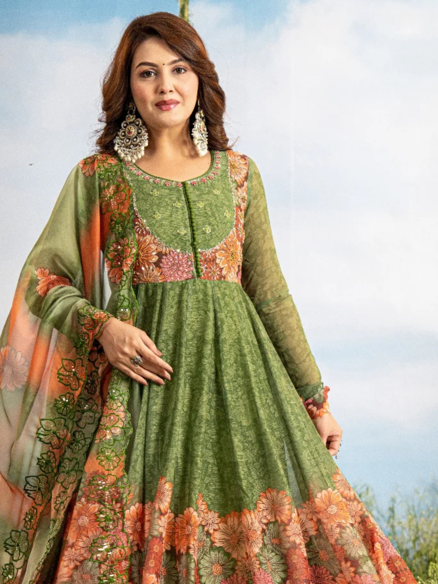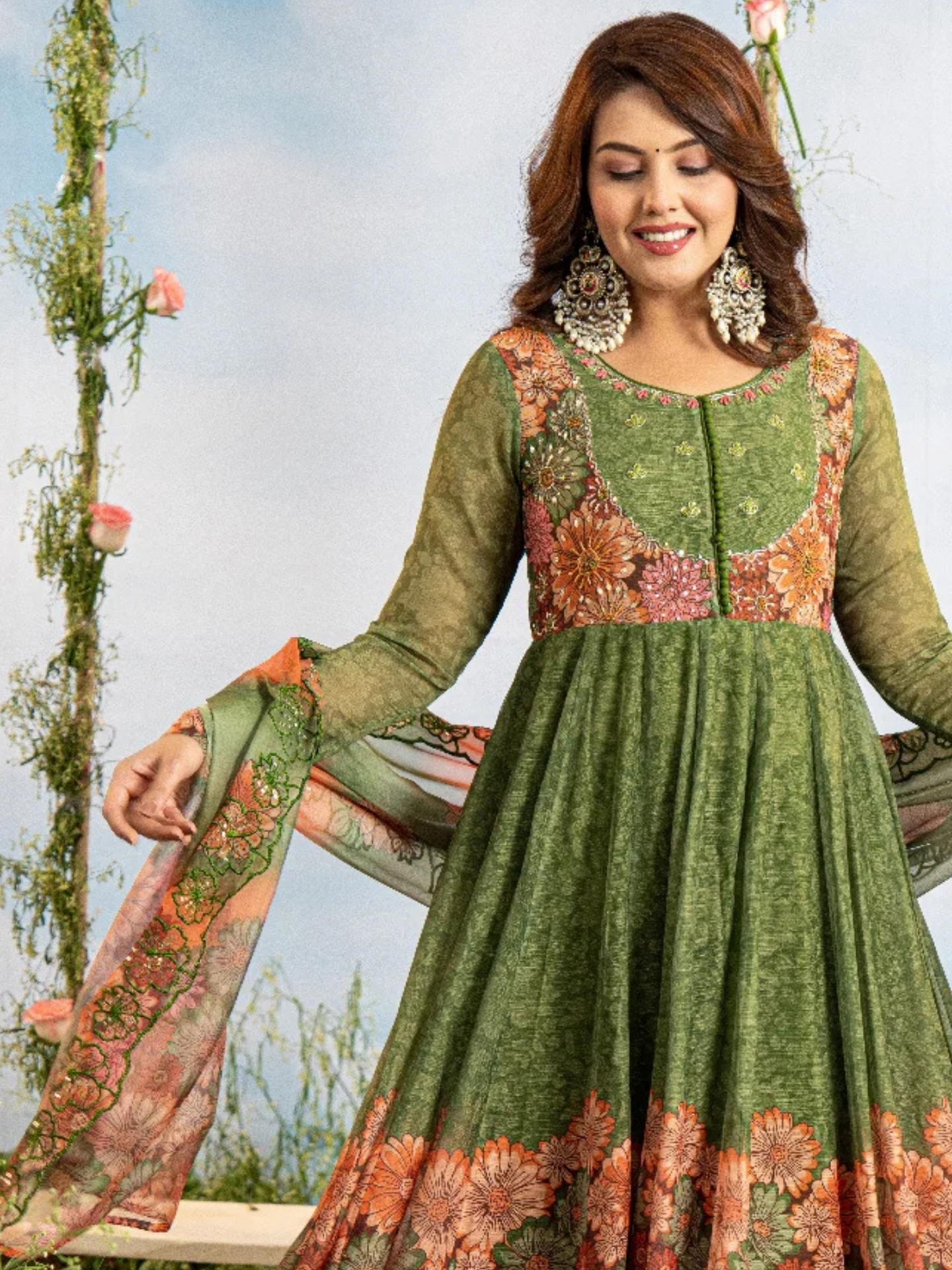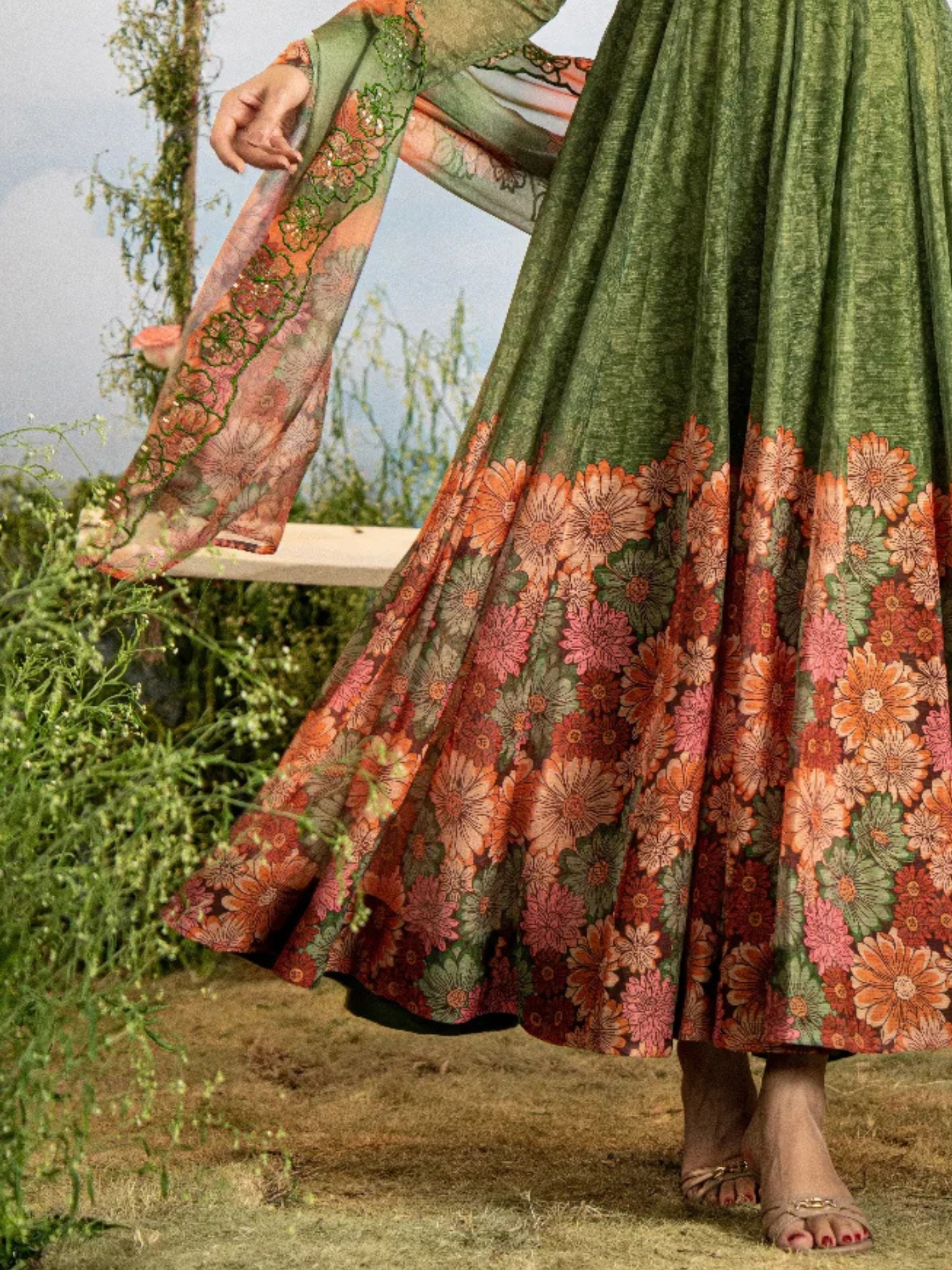 Kurta: Flowing Anarkali silhouette in rich green shade, beautifully detailed with floral embroidery on the yoke and bold floral prints along the flare. Full-sleeved design adds elegance and traditional appeal.
