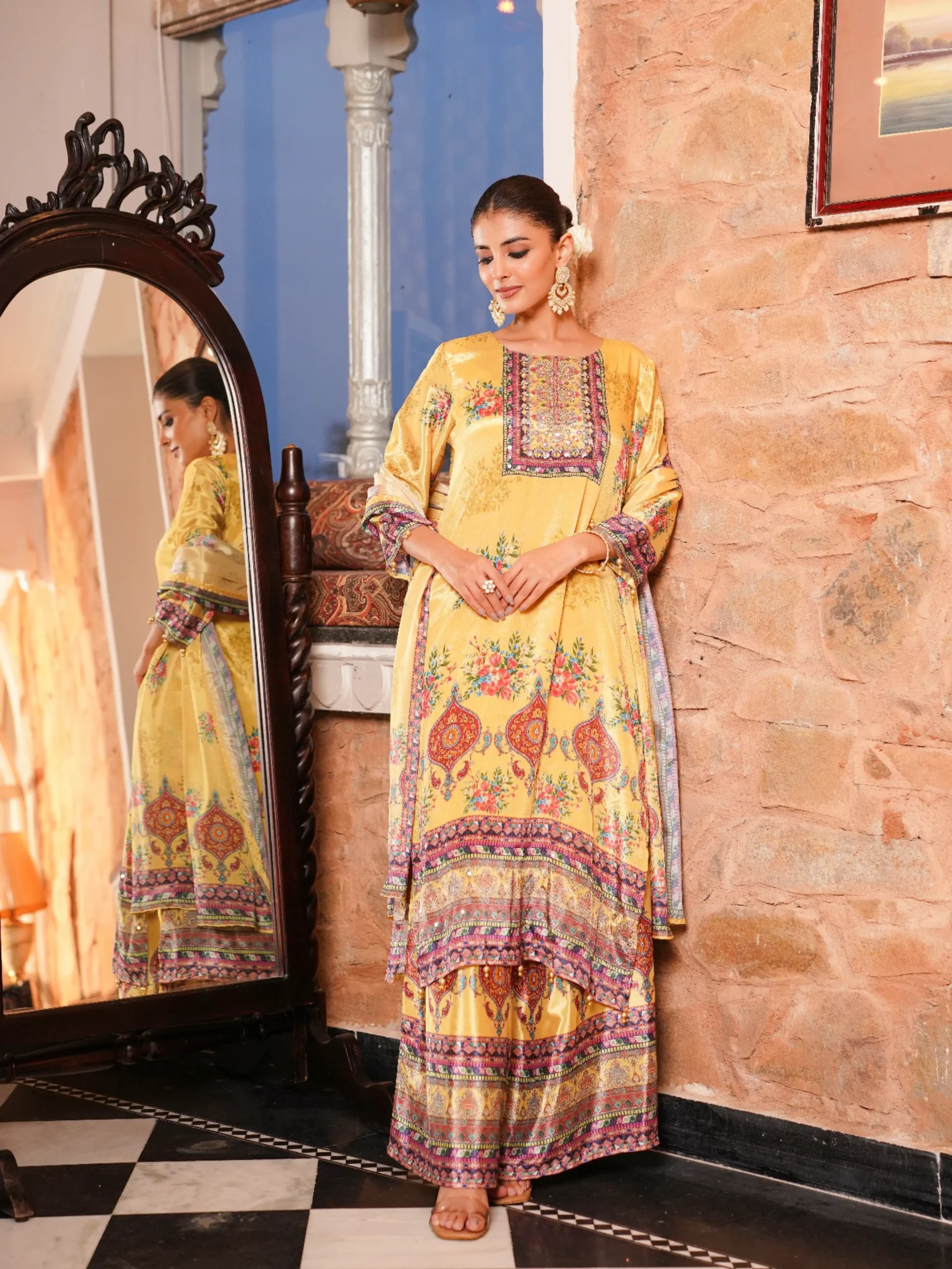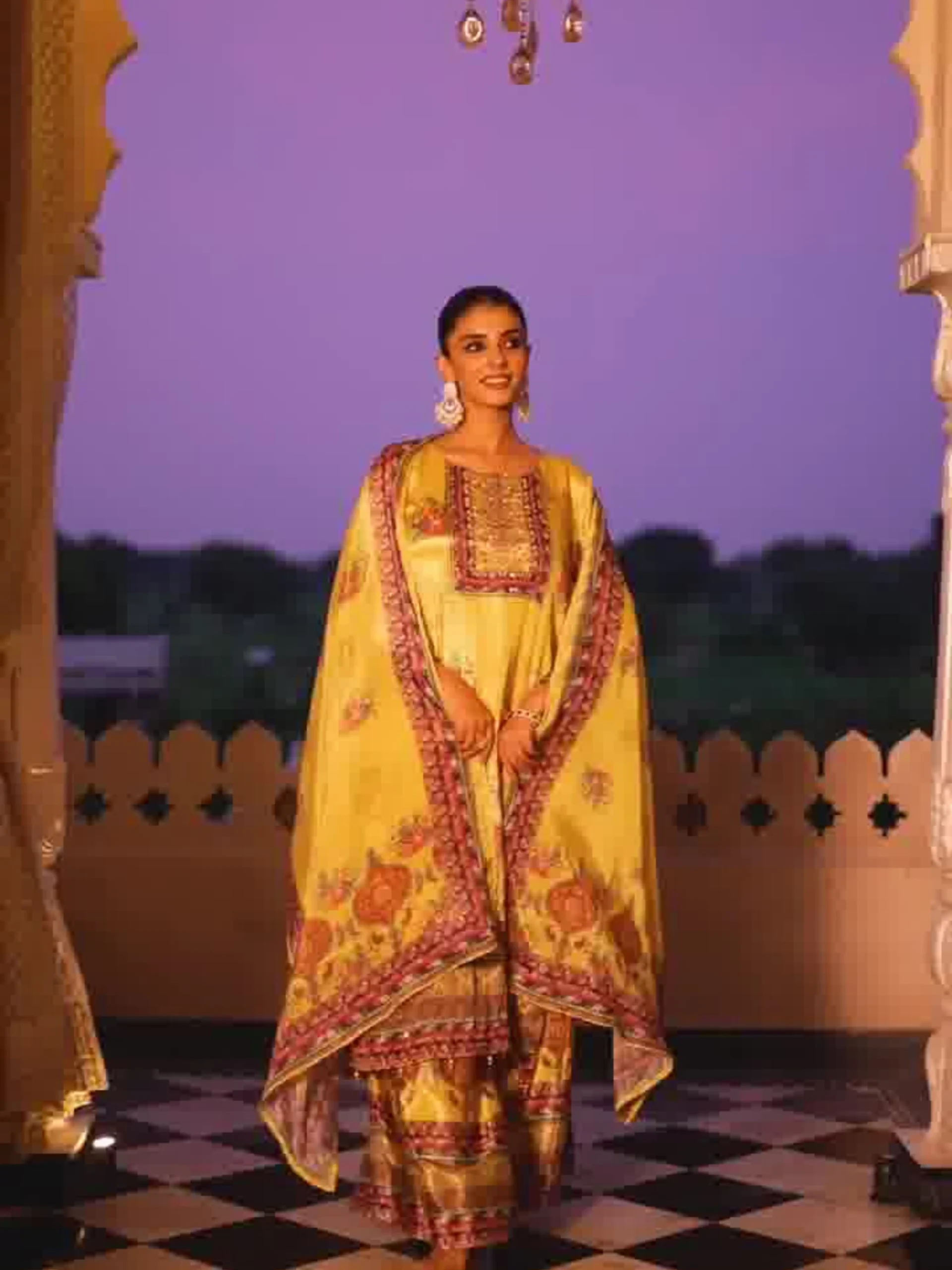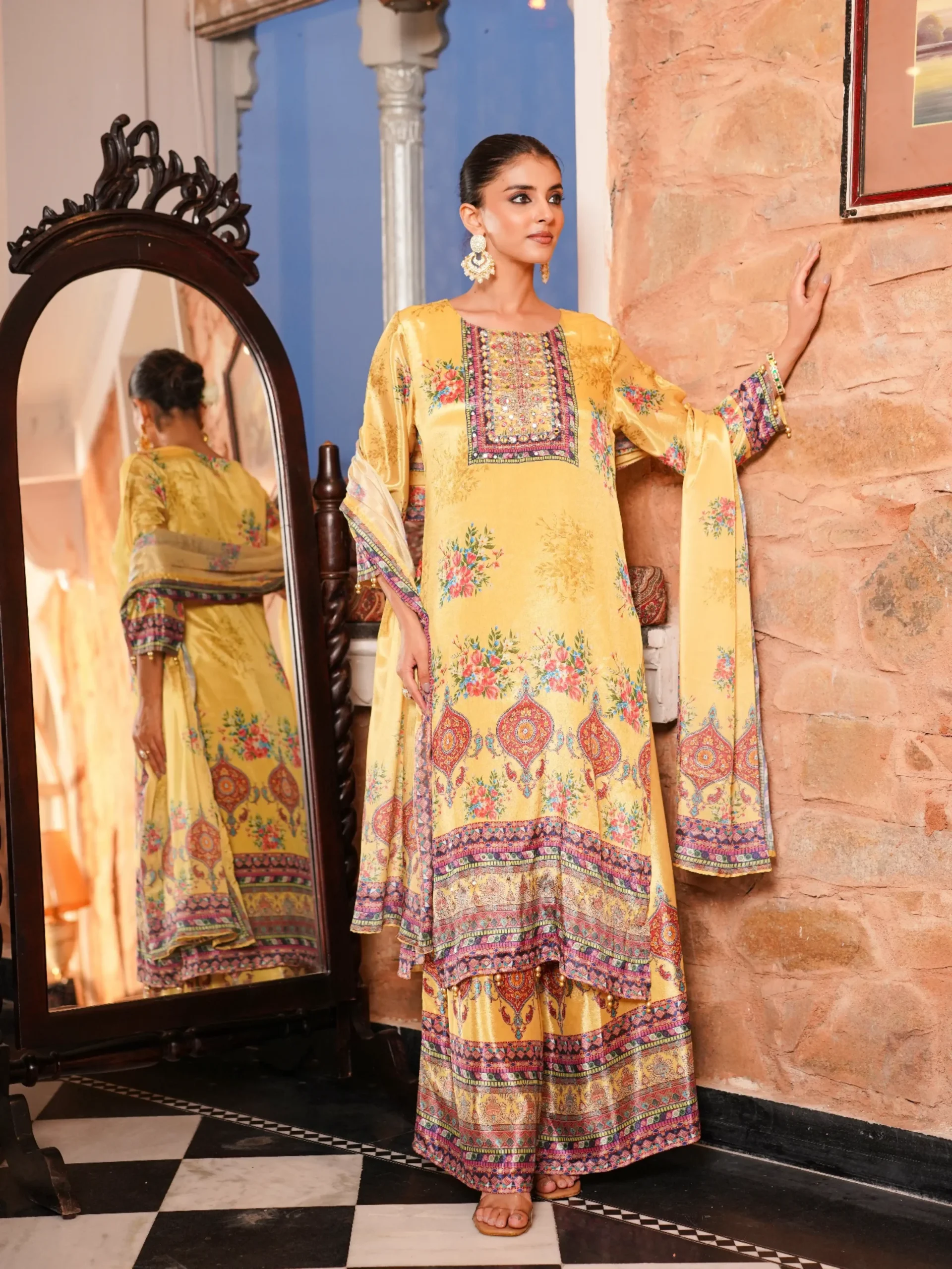 Dupatta: Lightweight Chinnon dupatta with printed border detailing, completing the outfit with grace.