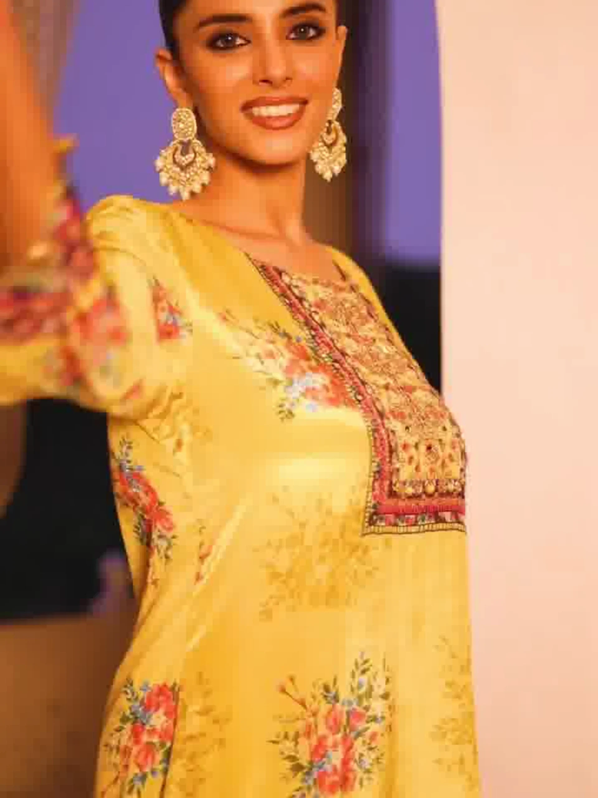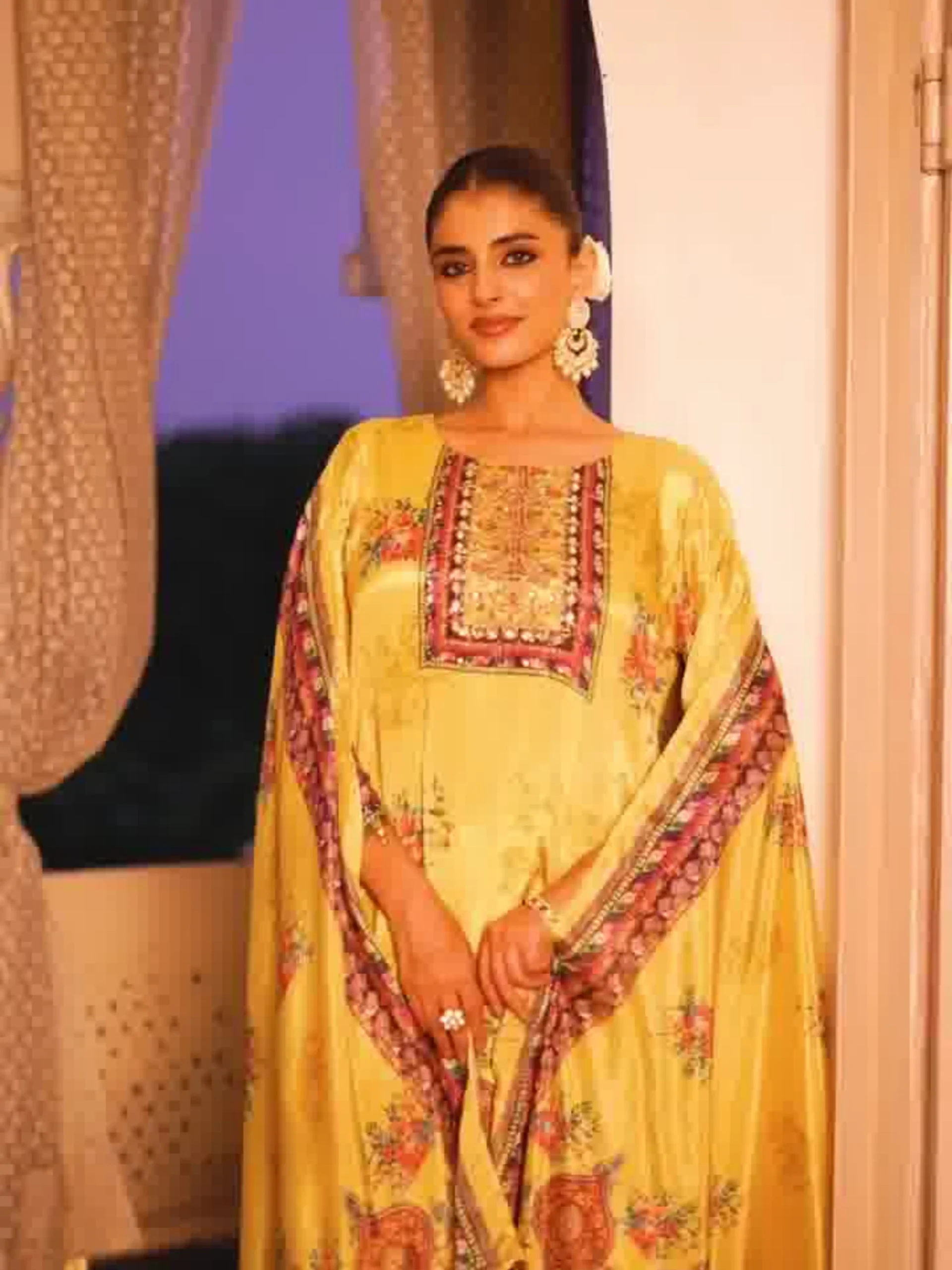 Elegant yellow Pure Chinnon set featuring a straight kurta with divider pant and matching dupatta. Designed with intricate floral and ethnic prints, perfect for festive and party occasions. Available in sizes M, L, XL, and 2XL.